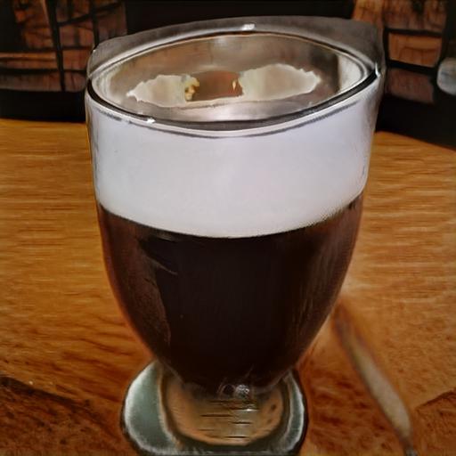 a semi normal looking brown ale in a chalice type glass, the the top of the beer inside the glass is a little transparent, showing the wood table behind it.