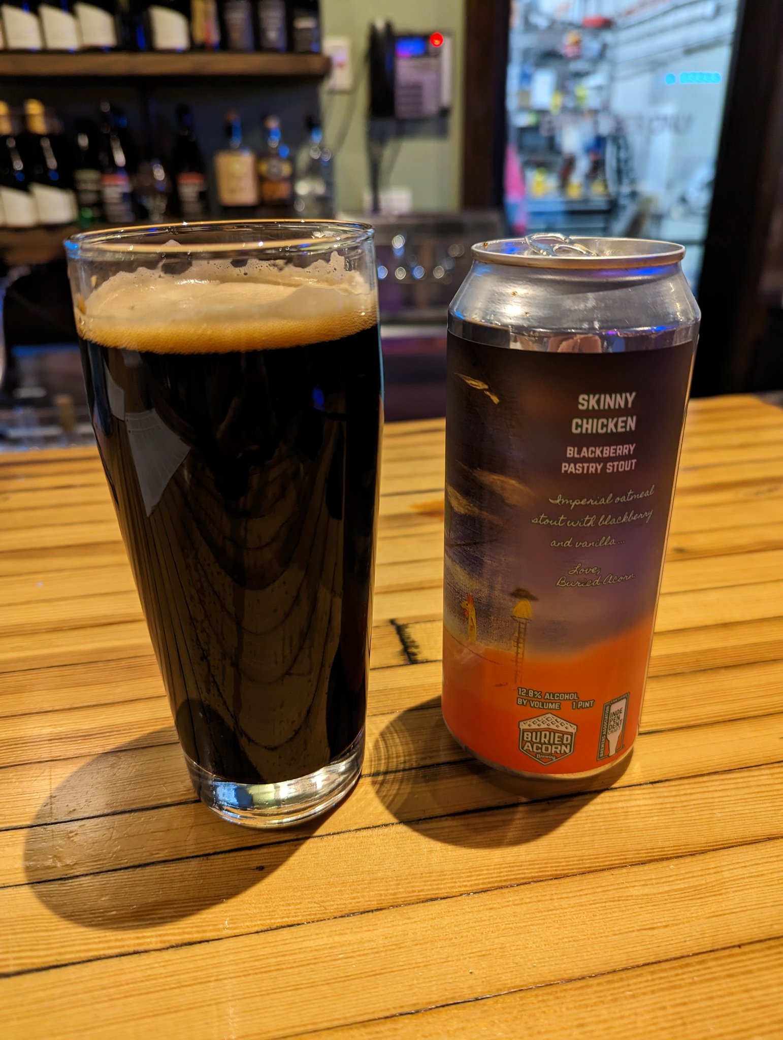 Jason is drinking a Skinny Chicken 12.8% blackberry pastry stout from Buried Acorn